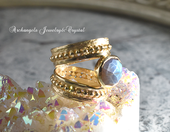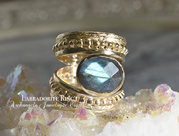 ラブラドライトを使った、オリエンタルなデザインのリングです。