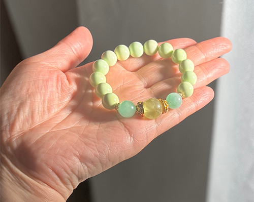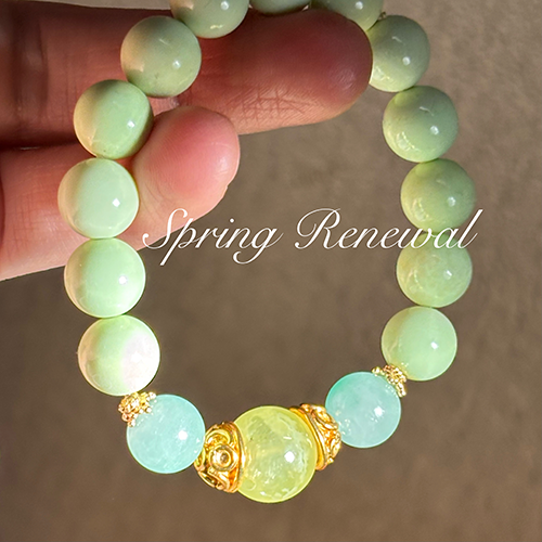 グリーン系の爽やかなカラーのクリスタルを揃えてブレスに仕立てました。